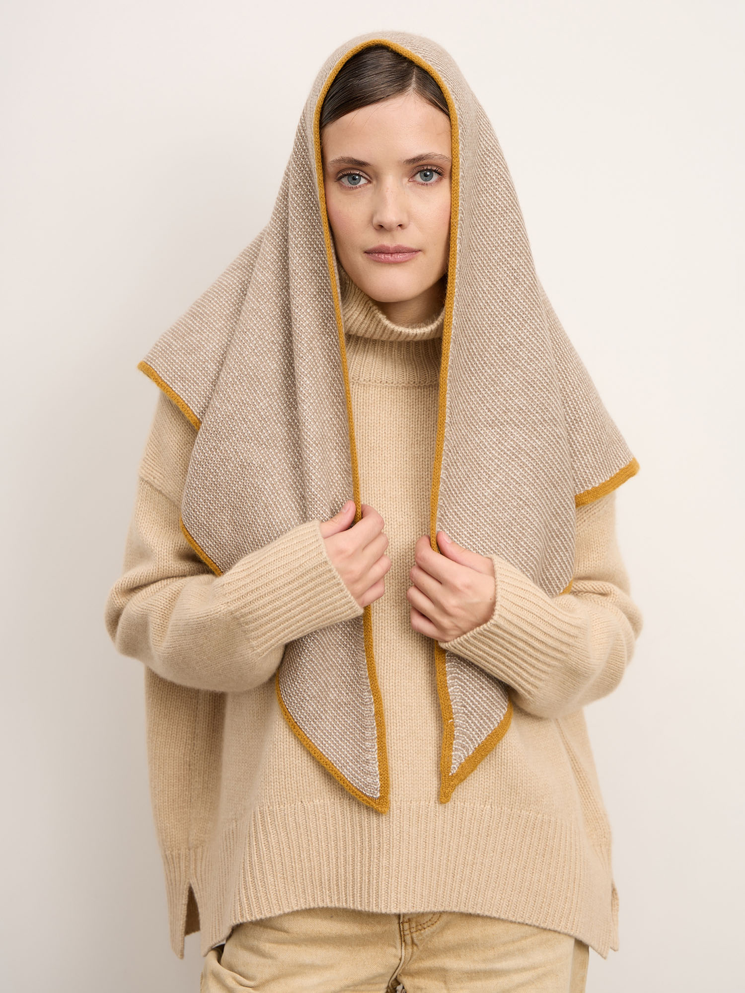 Треугольная форма косынки с аккуратной контрастной окантовкой по краю. Фактурная вязка придает изделию объем и выразительность, а золотистая отделка подчеркивает премиальный характер модели. Универсальный крой позволяет носить аксессуар различными способами — как головной убор, накинутым на плечи или обернутым вокруг шеи.