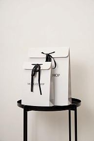 Лаконичный белый цвет с фирменным логотипом, дополненный контрастной черной лентой. Универсальный и эстетичный вариант для любого повода.