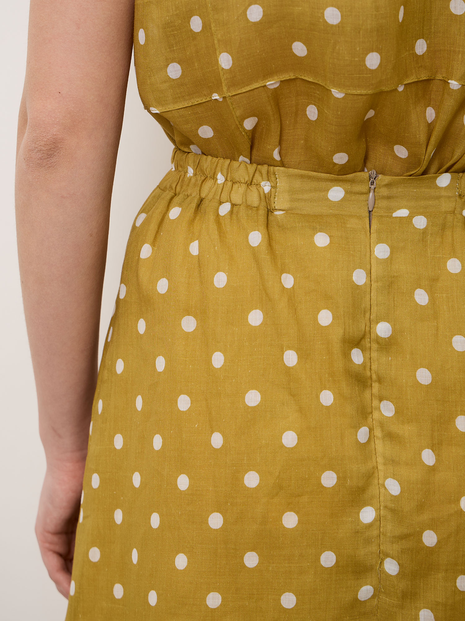 Юбка из тенселя 8011946 в зелёном оттенке с принтом в горошек — женственная и лёгкая модель, которая идеально подходит для тёплого сезона. Классический силуэт миди и аккуратный ретро-принт создают элегантный и стильный образ. Юбка гармонично сочетается с блузой из той же ткани или базовыми топами, позволяя создавать утончённые повседневные комплекты.