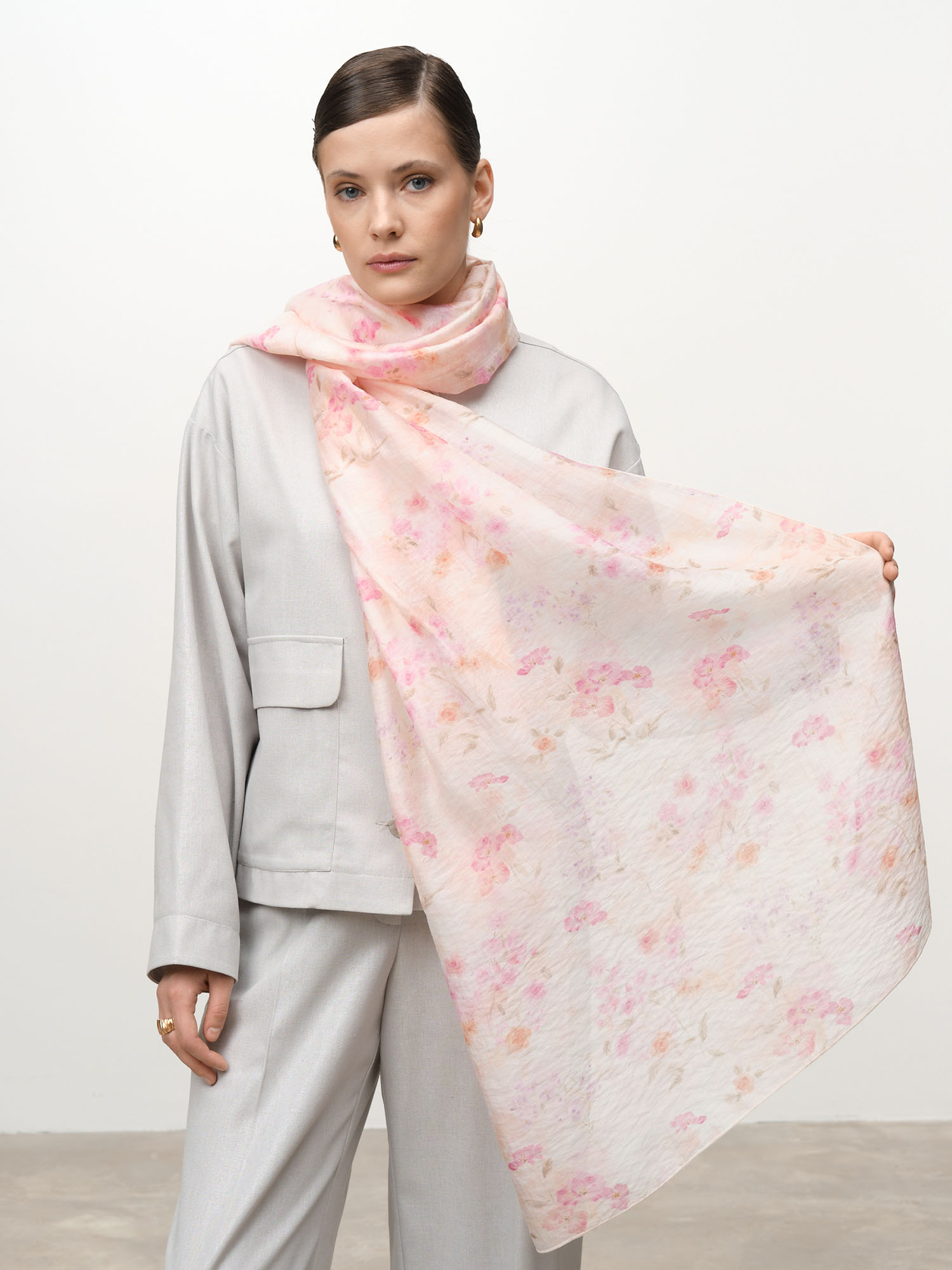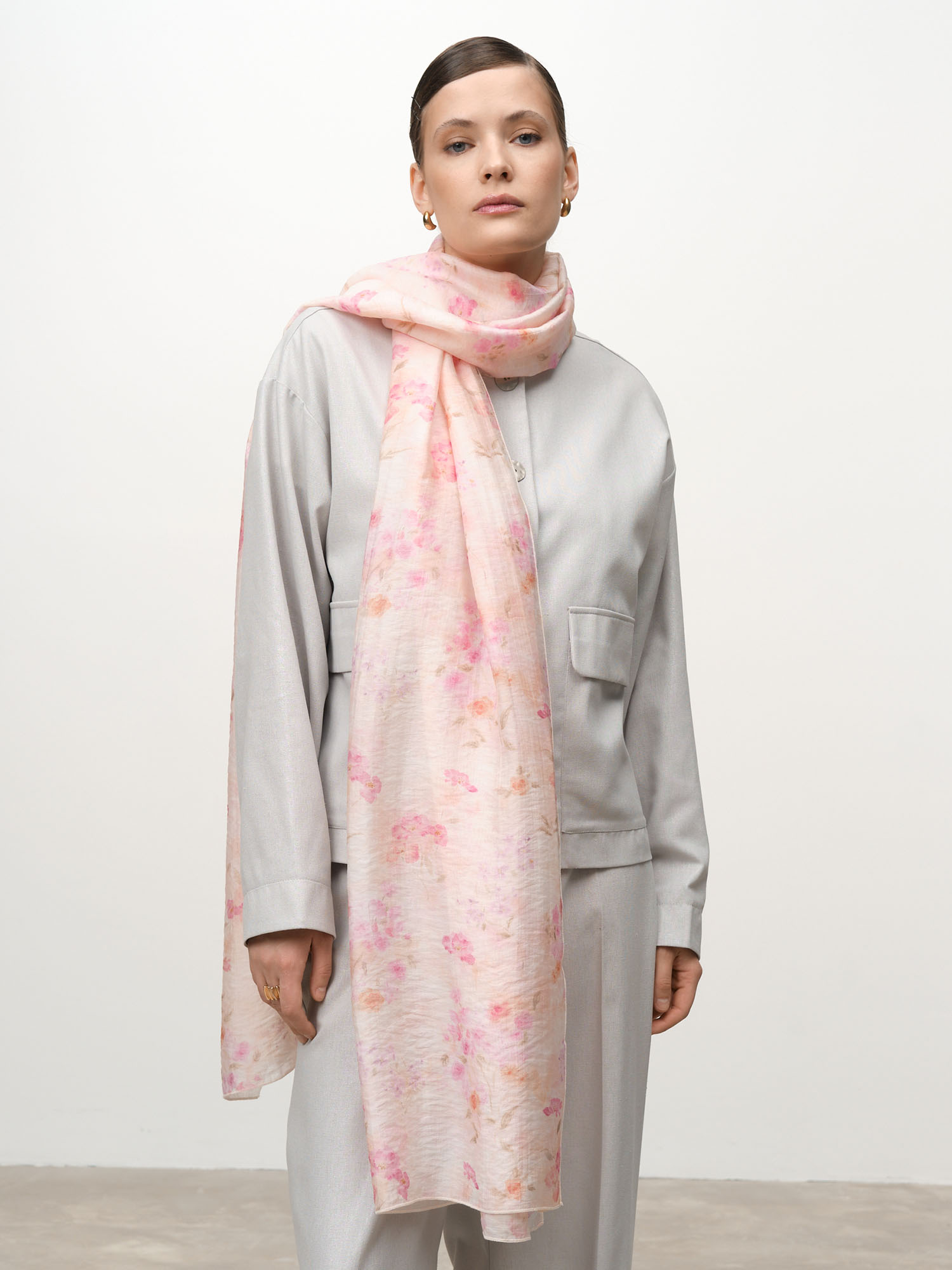 Легкий струящийся палантин увеличенного размера, с аккуратно обработанными краями и изящным цветочным рисунком. Отлично драпируется и красиво ложится в образе.