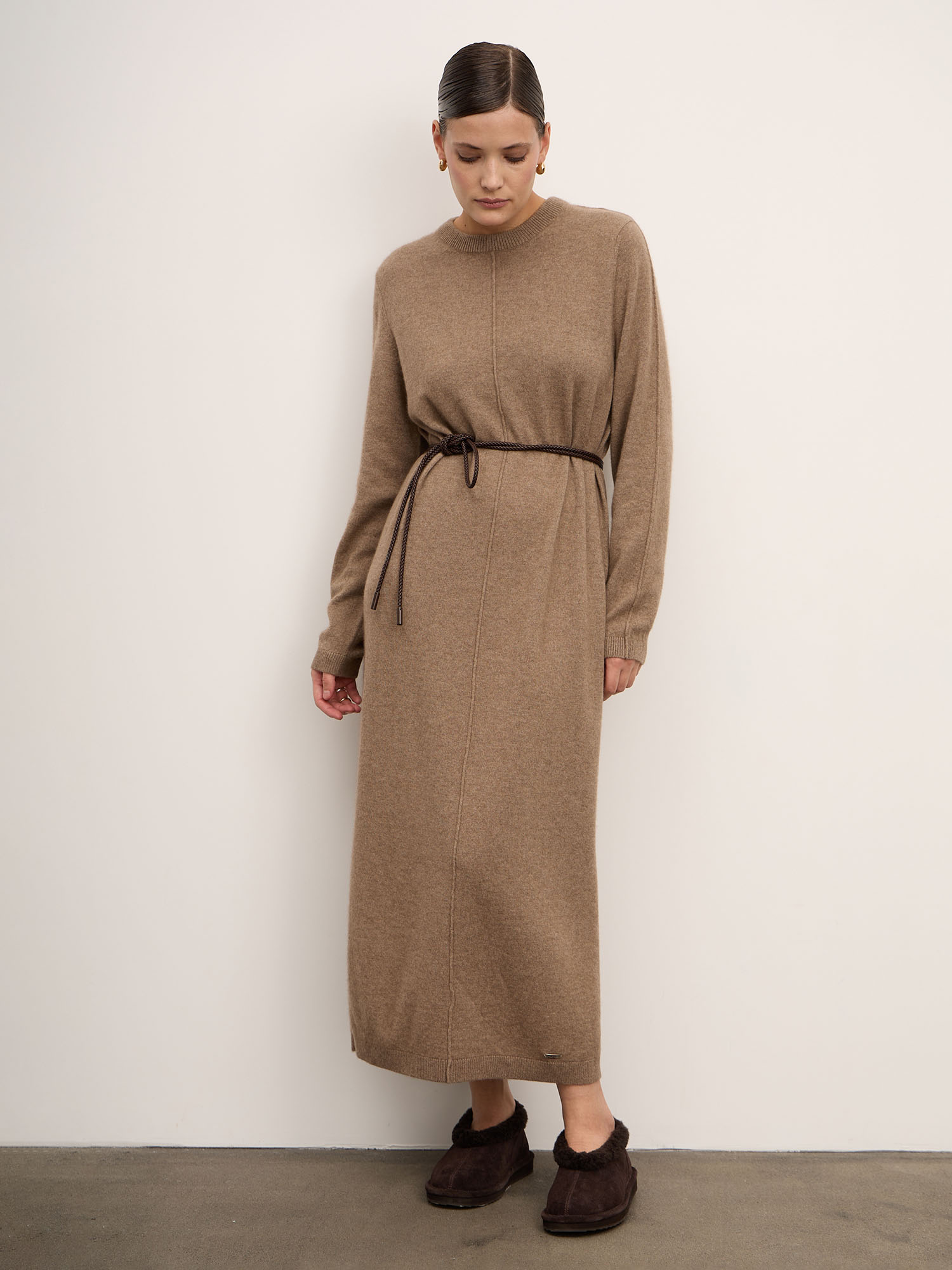 Платье выполнено в лаконичном прямом крое с длинными рукавами и округлым вырезом горловины. Эластичная вязка обеспечивает идеальную посадку и комфорт в движении. Натуральный оттенок капучино подчёркивает природную эстетику кашемира, делая образ мягким и женственным.