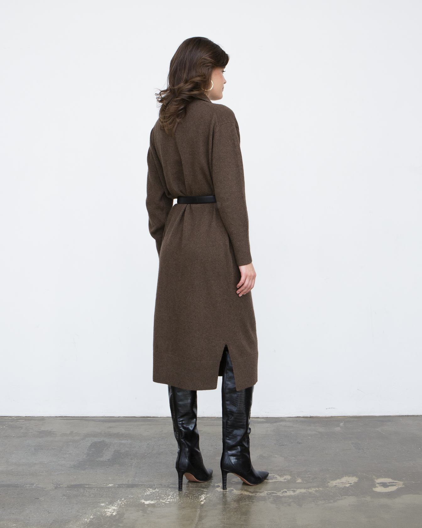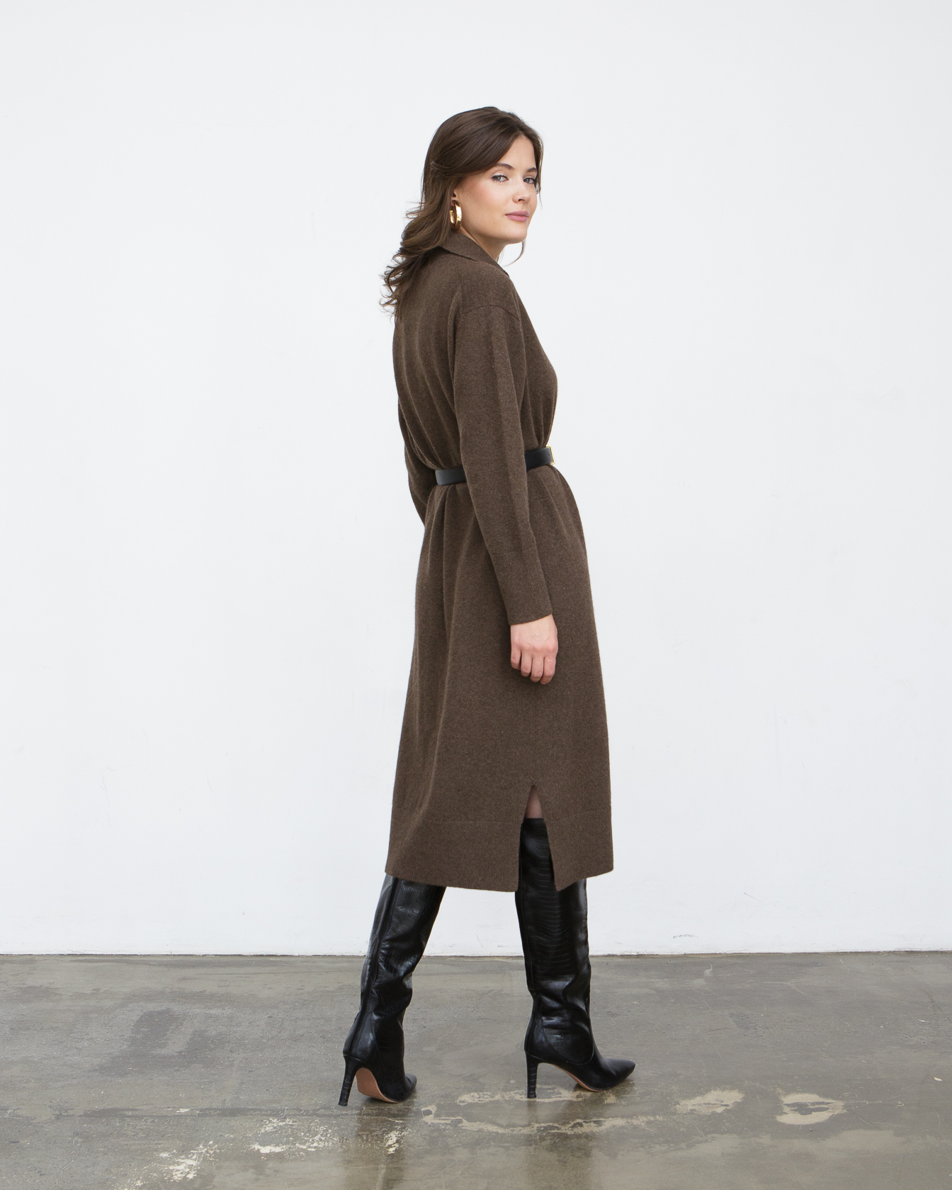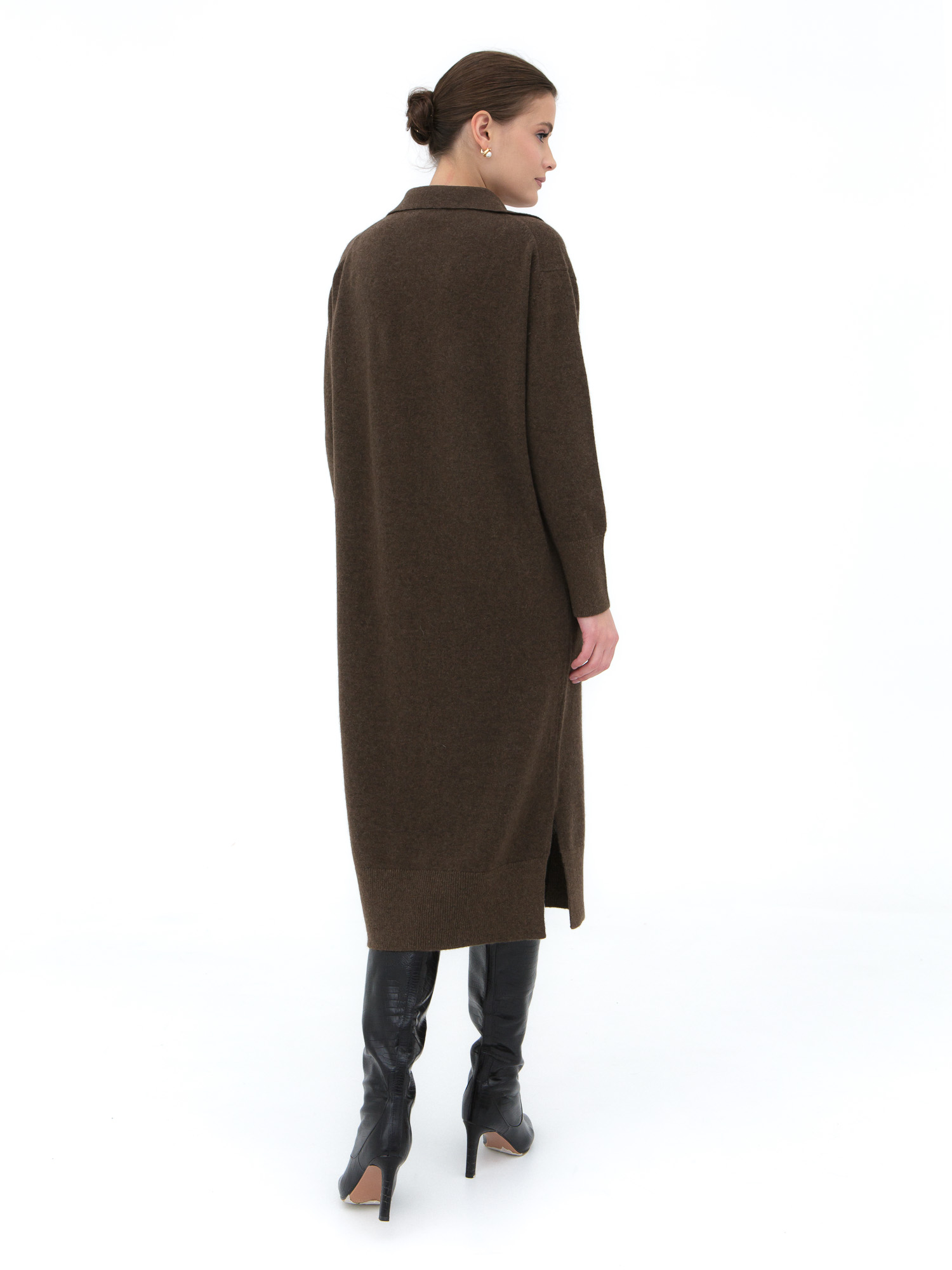 Прямой силуэт миди-длины с аккуратным воротником-поло и боковым разрезом для свободы движений. Лаконичный крой делает модель универсальной и вне времени.